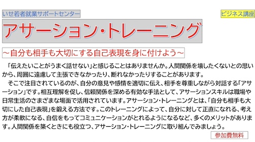 いせ若者就業サポートセンター ビジネス講座アサーション・トレーニング日時 2025 年 12 月 20 日(土)、27 日(土)14:00~15:30 参加費無料